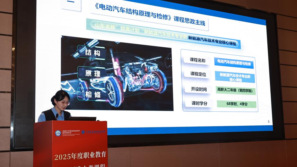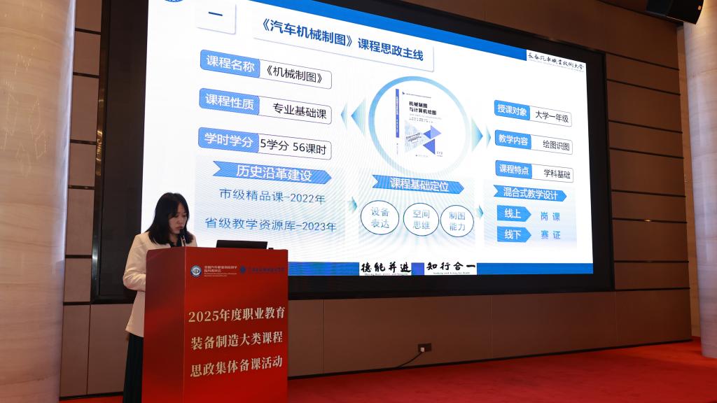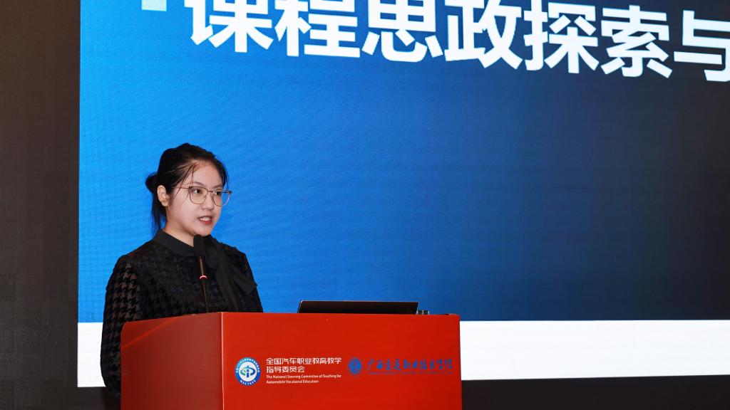 在课程思政优秀案例说课环节,来自长春汽车职业技术大学、烟台职业学院、北京科技职业大学、天津交通职业学院的四位教师,依次展示了《汽车机械制图》《电动汽车结构原理与检修》《新能源汽车维修企业管理》《新能源汽车构造》课程思政教学案例。