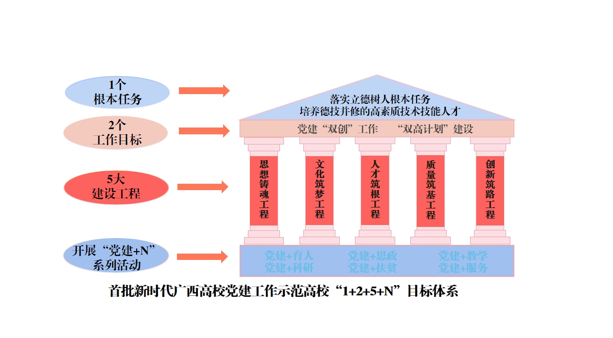 目前,广西交职院已形成““1+2+5+N” 党建目标体系,明确任务目标、责任主体、具体举措,创新实施“年目标、季督导、月安排、周行动、日推进”运行机制,在全校营造“千斤重担人人挑、人人身上有指标”抓党建讲党建干党建的工作格局,树立起“考核干部考党建、任用干部看党建、用好干部促党建”的鲜明导向。
