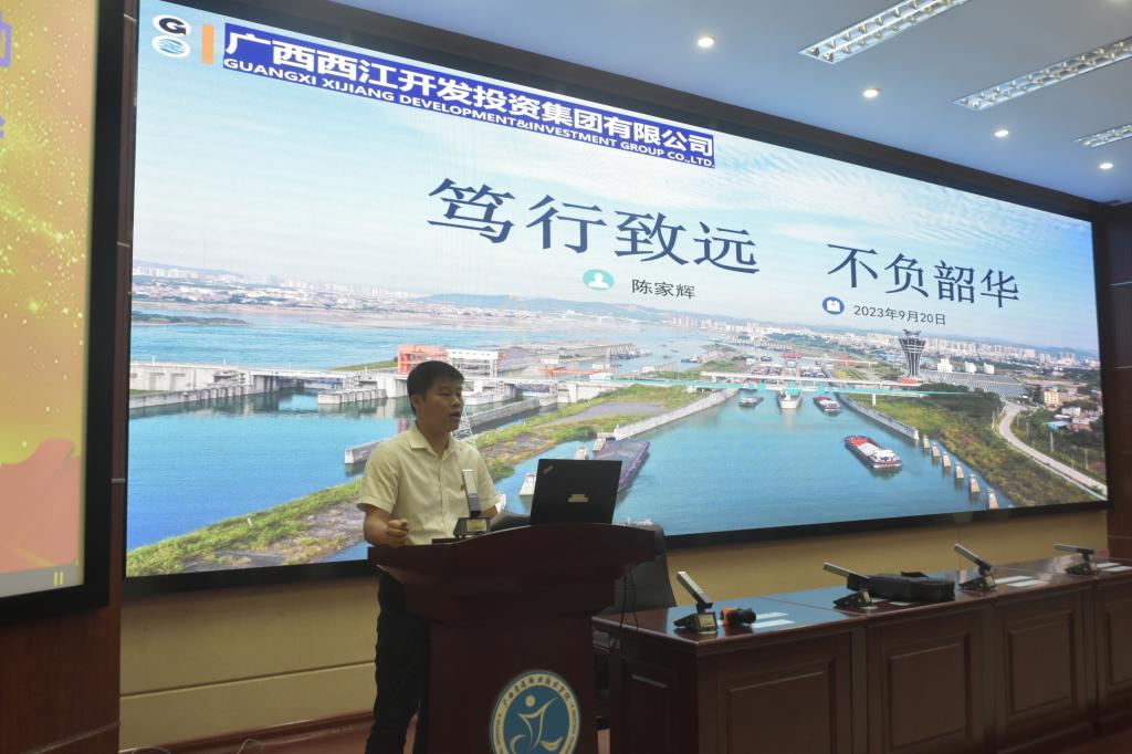 广西西江开发投资集团有限公司船闸运营管理分公司的陈家辉讲述了他十几年如一日,扎根西江船闸运行一线岗位,从“职场小白”成长为“广西交通技术能手”、“广西五一劳动奖章”获得者的经历,鼓励同学们“努力把自己锻造成知识型、技能型、创新型高技能高素质产业工人”。