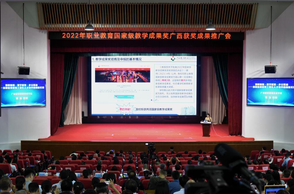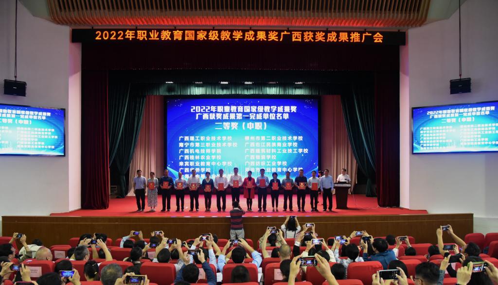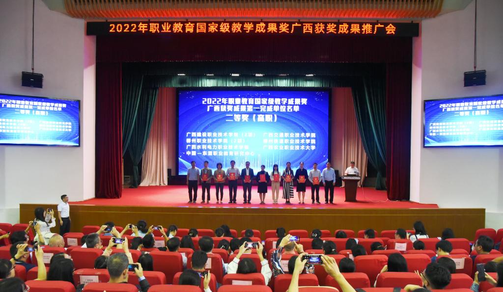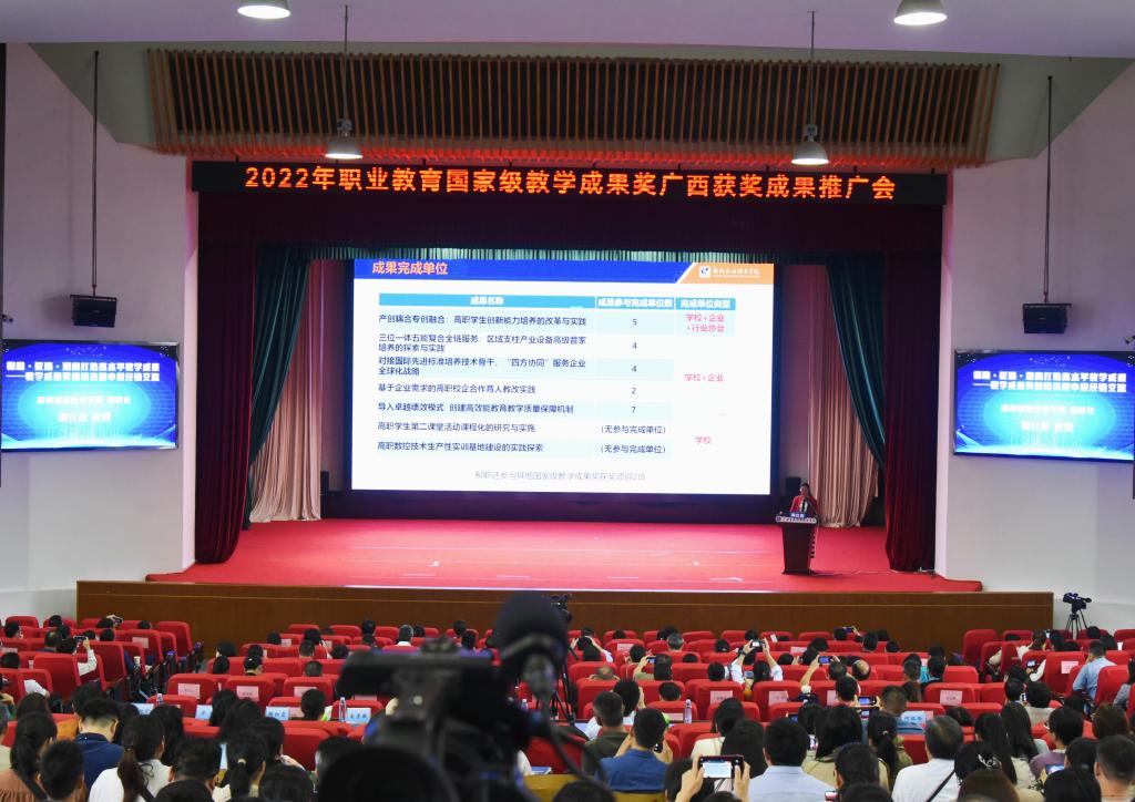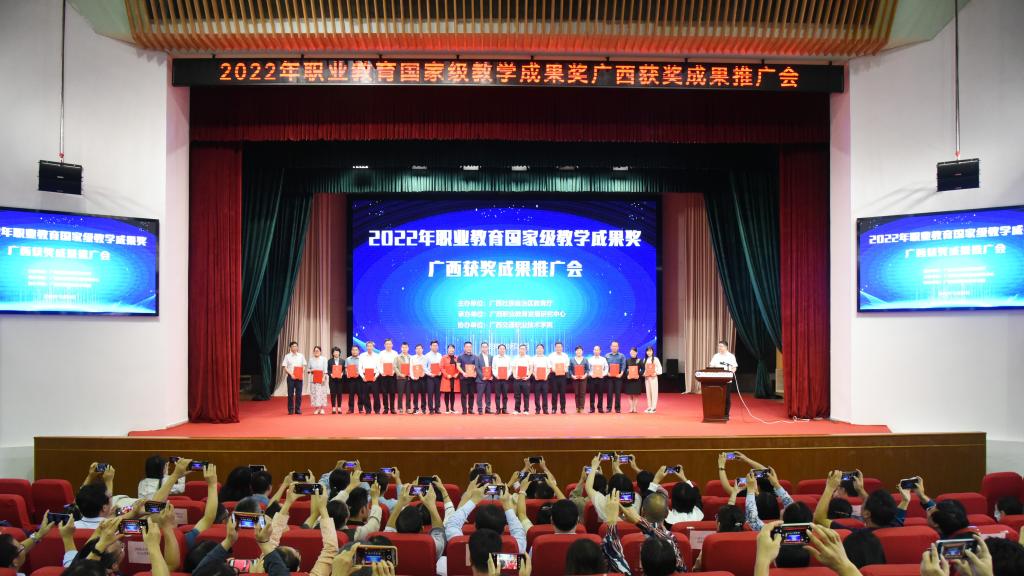 自治区教育厅职成处处长覃壮才在致辞中表示,开展教学成果奖励活动是加快建设教育强国、落实立德树人根本任务的重要举措,是对学校人才培养工作和教育教学改革成果的检阅和展示。宣传、推广教学成果,是引导广大职业院校深入学习借鉴,推进职业教育教学改革创新,激励教师潜心教学,营造职业教育改革发展良好氛围,推动职业教育高质量发展的重要抓手。他指出,自治区教育厅一直以来高度重视职业教育教学成果奖的培育与推广,在2022年职业教育国家级教学成果奖评审中,广西共获奖24项,其中一等奖2项、二等奖22项。希望获奖成果的经验分享能够激励、引领广西的职业院校同仁们,在各项实践工作中锤炼精品,追求卓越,追求创新,形成更多具有广西特色的教学成果。