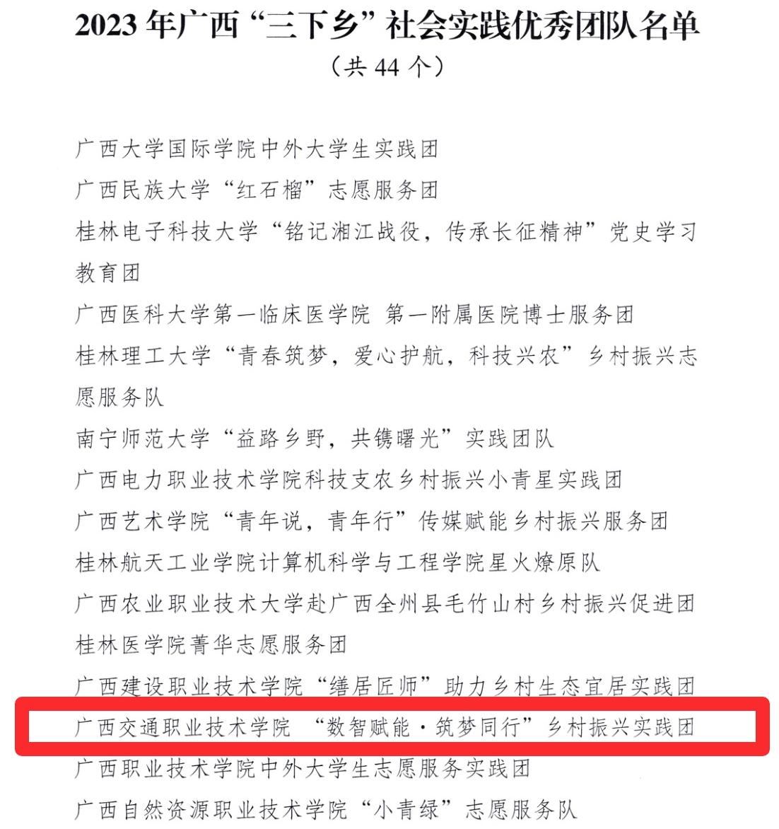 (校团委 讯 )近日,学校在2023年全国和广西大中专学生志愿者暑期文化科技卫生“三下乡”社会实践活动评奖评优中再获佳绩。