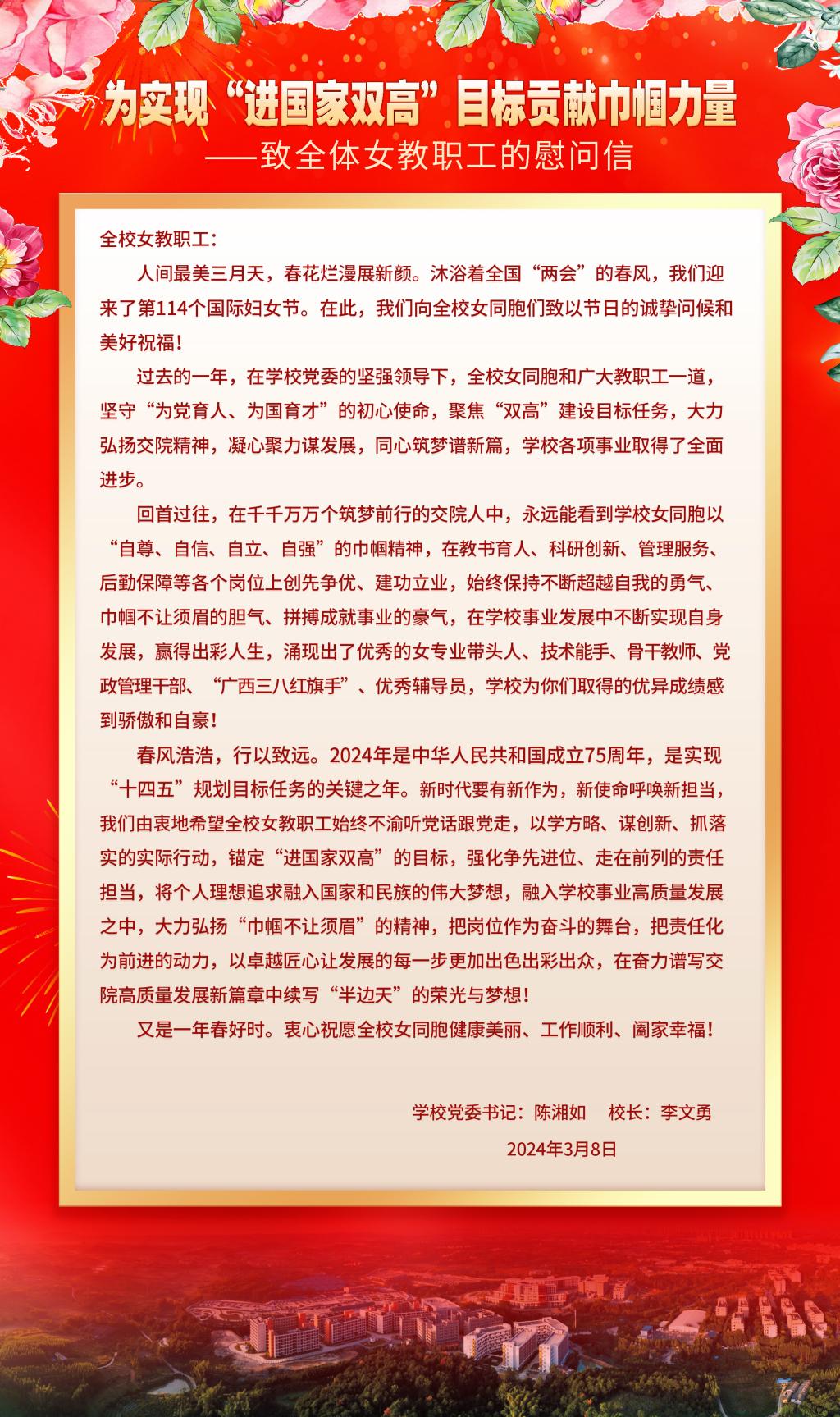 温情慰问送祝福,暖意关怀沁人心。“3月8日妇女节当天,学校党委书记陈湘如、校长李文勇向全校女同胞致慰问信,勉励全校女教职工“以学方略、谋创新、抓落实的实际行动,锚定“进国家双高”的目标,强化争先进位、走在前列的责任担当”,“以卓越匠心让发展的每一步更加出色出彩出众,在奋力谱写交院高质量发展新篇章中续写“半边天”的荣光与梦想”。