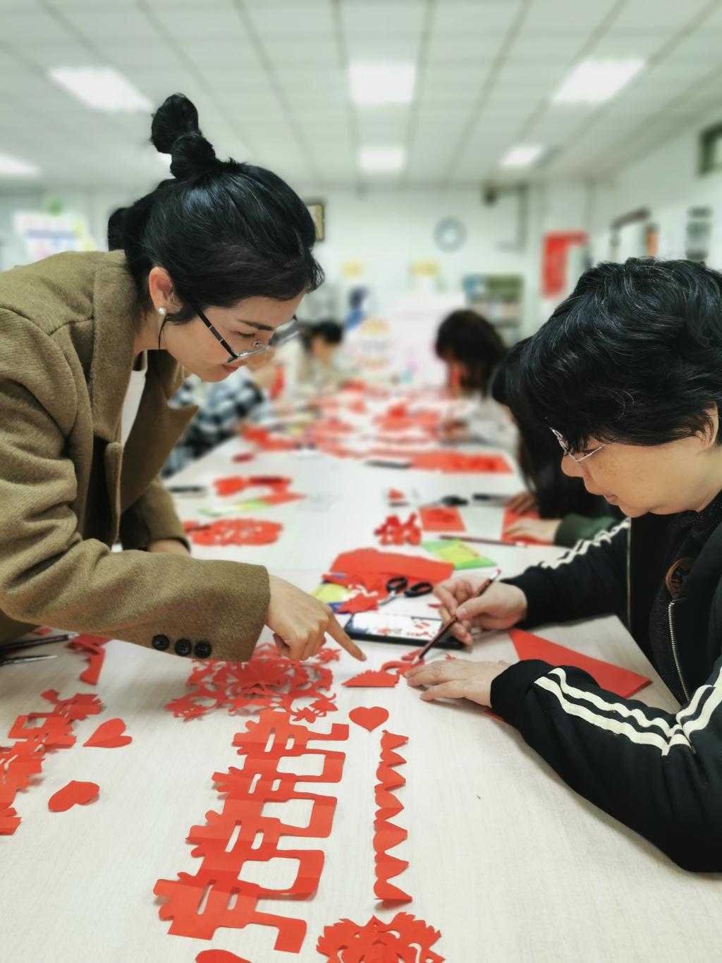 折纸、勾画、剪裁,现场女同胞在老师的示范指导下,剪出了一幅幅寓意丰富的作品——“中华民族是个大家庭,‘党’字表达各族人民永远听党话跟党走的拳拳之心”;“春”是希望和祝福……参加活动的女教职工们一边展示自己的剪纸作品,一边解释作品的丰富内涵,传递团结、进取、乐观向上的正能量。