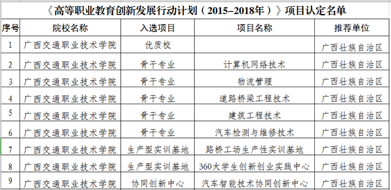 据了解,本次《高等职业教育创新发展行动计划(2015-2018年)》认定了优质专科高等职业院校、骨干专业、生产性实训基地、“协同创新中心”、双师基地、虚拟仿真实训中心、技能大师工作室等7类项目。其中,我院推荐的9个项目成功入选,具体项目名单如下: