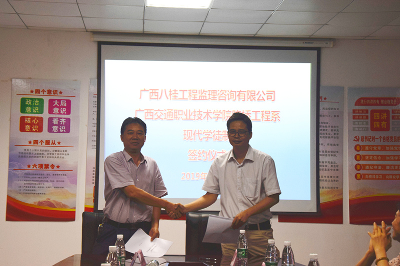 (路桥工程系讯李振成、李丽晶、蒋雄/文 林海全/图)6月4日,广西八桂工程监理咨询有限公司与学院路桥工程系在副楼315会议室举行现代学徒制签约仪式。出席本次签约仪式的人员有公司总经理覃仕华,总会计师、工会主席黄海芝,党群工作部经理卢慧萍,党群工作部业务员李霞以及路桥工程系莫品疆主任、刘振华老师。