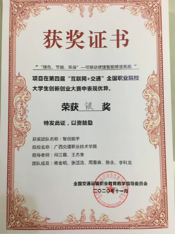 (汽车工程学院 讯 梁业灿/文 王杰身/图)近日,由全国交通运输职业教育教学指导委员会主办的第四届“互联网+交通”全国交通运输职业院校创新创业大赛决赛在陕西交通职业技术学院举行。PP电子学子参赛项目“‘绿色、节能、环保’—可移动便捷智能喷漆系统”夺得银奖。
