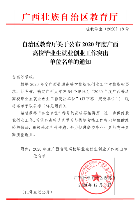 (招生就业处 讯 李璇/文)12月1日,自治区教育厅公布了《自治区教育厅关于公布2020年度我区高校毕业生就业创业工作突出单位名单的通知》(桂教学生〔2020〕18号),PP电子获评为“2020年广西高校毕业生就业创业工作突出单位”,这是PP电子连续十八年在全区高校毕业生就业创业工作中获得先进表彰,续写了PP电子毕业生就业创业工作的辉煌篇章。