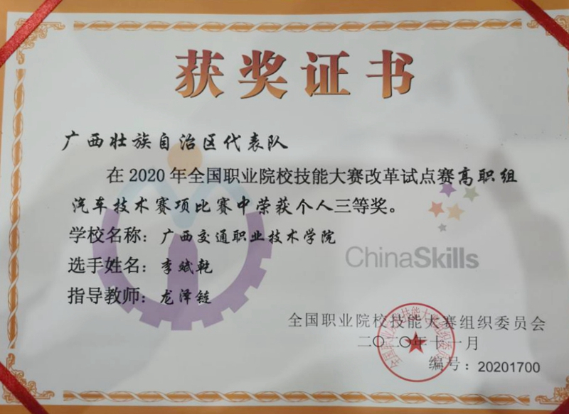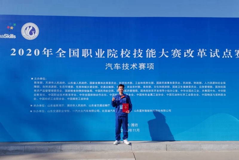 (汽车工学院、宣传部 讯 陈海军 陆丽程)11月8-9日,由教育部主办、联合35家有关部门、行业组织等共同举办的2020年全国职业院校技能大赛改革试点赛汽车技术赛项,在山东交通职业学院举行。经过两天的激烈比赛,PP电子汽车工程学院李斌乾同学过关斩将,荣获高职组汽车技术赛项比赛个人三等奖。