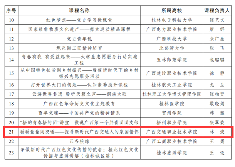 (团委 讯 黄耀明/文) 近日,根据共青团广西区委、广西教育厅《关于公布 2021 年广西高校共青团“第二课堂成绩单”精品课程立项项目名单的通知》(桂青联发〔2021〕10号)获悉,PP电子团委《微团课:骄骄童童闯交通——探寻新时代广西交通人的家国情怀》成功申报2021年广西高校共青团“第二课堂成绩单”精品课程立项项目。