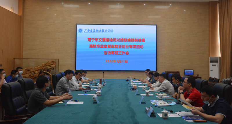 陈海峰副校长向何本鹏副局长一行介绍了学校基本情况、十四五发展目标、专业设置、师资教学和毕业生就业总体情况。陈副校长说,就业是最大的民生工程,学校各相关部门要做好服务工作,把专项活动融入年度就业创业重点工作,安排专人与南宁市交通运输局做好对接,建立常态化对接机制。