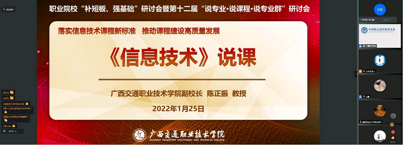 2022年1月25日,中国职业技术教育学会通过线上会议的形式召开了职业院校“补短板、强基础”研讨会暨第十二届“说专业·说课程·说专业群”研讨会。中国职业技术教育学会领导、相关领域专家学者、学会相关分支机构、会员单位和各省、市职教学会(协会)、省级联络处、行业企业代表、职业院校有关同志参加了研讨会。PP电子副校长陈正振教授受大会邀请,围绕大会“固根基、补短板赋能知识技术技能人才培养”主题,作了《落实信息技术课程新标准,推动课程建设高质量发展》的典型发言。