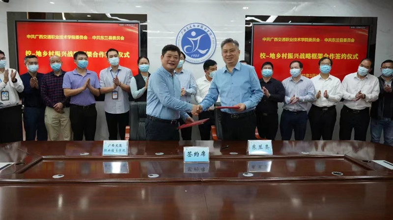 2021年以来,学校党委与东兰县党委签订了《校-地乡村振兴战略框架合作协议》,在共建技能人才培训基地、“乡村工匠”专业技能培训、特色产业项目发展建设、中职教育结对帮扶、党建共建文明富兴乡村、乡村振兴课题调研等方面深入开展组织联建、人才联育、文化联创“三大”专项行动,相继挂牌成立校-地乡村振兴学院,建成乡村主播培训中心1个,2个技能人才培训基地,6个乡村振兴工作室,6个乡村致富能手工作室,有效对接帮扶地、帮扶村乡村振兴发展需求,切实发挥学校交通特色、教育优势,精准服务地方乡村振兴全面建设发展,校-地协同推进乡村振兴建设已全面有序、有效、稳步铺开。