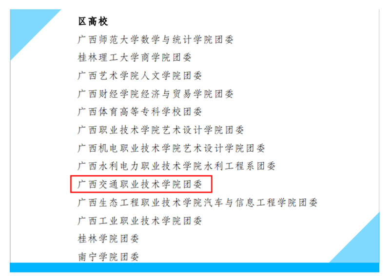 近年来,学校党委全面加强对共青团工作的领导,以服务脱贫攻坚、乡村振兴、交通强区等重大民生工程为重点,带领学校团委坚持为党育人、服务大局,锚定增强组织力、引领力、服务力和对大局贡献度,打造“骄骄童童闯交通”实践育人提质培优行动计划、“行走的微团课”等团属品牌项目,用青年喜闻乐见的方式教育引导交院学子增强实践能力、树立家国情怀,学校2022年首次获评“全国五四红旗团支部”、获评“广西五四红旗团委”,2021年度共青团工作被团广西区委考核为“优秀”等次。