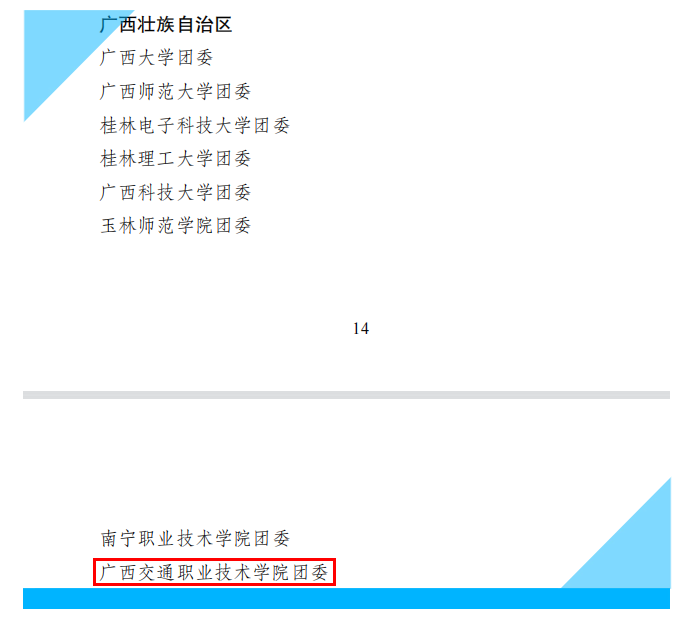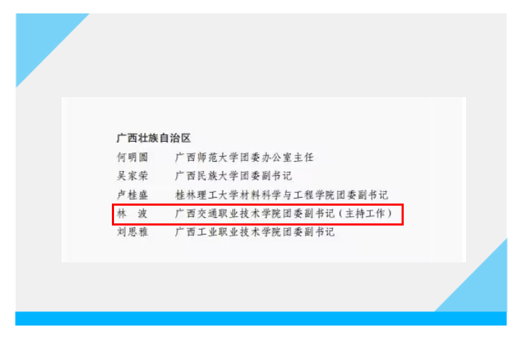全国优秀个人获得者、学校团委林波老师连续组织参与暑期社会实践与志愿服务活动12年,获评广西“三下乡”优秀指导老师(2013、2014),“镜头中的三下乡”征集活动全国入围奖(2013),“三下乡”国家级、自治区级重点团队(2021、2022)等相关荣誉16项,2020年、2021年撰写相关案例分别收录全国职业院校精准扶贫协作联盟编著《尽锐出战 精准发力——职业教育决战深度贫困县脱贫攻坚报告》,教育部指导编著《中国教育扶贫典型案例100》。