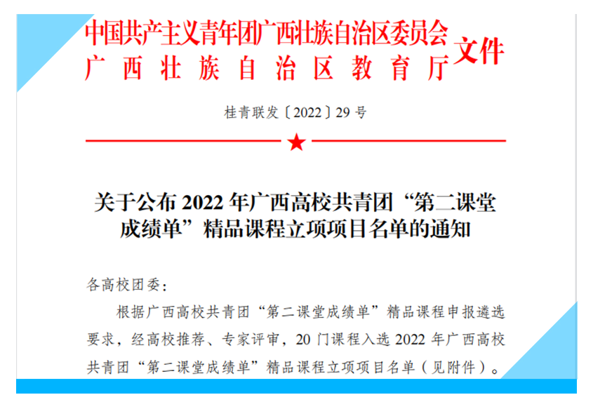 (校团委 讯 林波/文)近日,2022年广西高校共青团“第二课堂成绩单”精品课程立项项目名单公布,PP电子团委申报项目《骄骄童童闯交通——校友林里讲交院故事》成功入选获评立项。