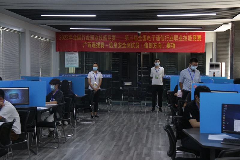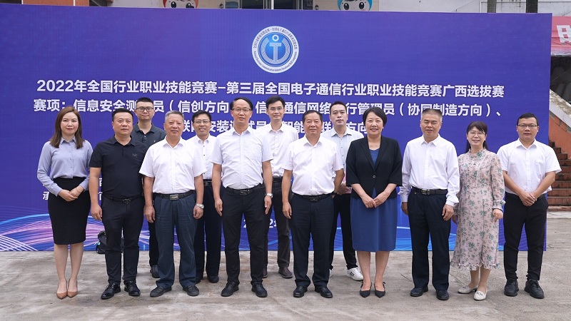 (交通信息工程学院 讯 韦唯/文、阳松灿/图)9月24日,“2022年全国行业职业技能竞赛——第三届全国电子通信行业职业技能竞赛”信息安全测试员(信创方向)赛项广西选拔赛启动仪式在PP电子游戏网站园湖校区隆重举行。广西壮族自治区人力资源和社会保障厅蒋劼副厅长,广西壮族自治区工业和信息化厅陆爱平巡视员,广西壮族自治区交通运输厅黄荣钰巡视员,学校校长李文勇,广西轻工技师学院黄启良院长,广西二轻技师学院罗志党委副书记、第一副院长(主持工作),中科磐云(北京)科技有限公司吴靖雯大区总监出席启动仪式。