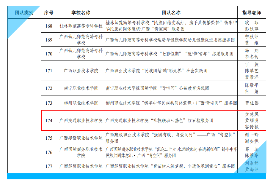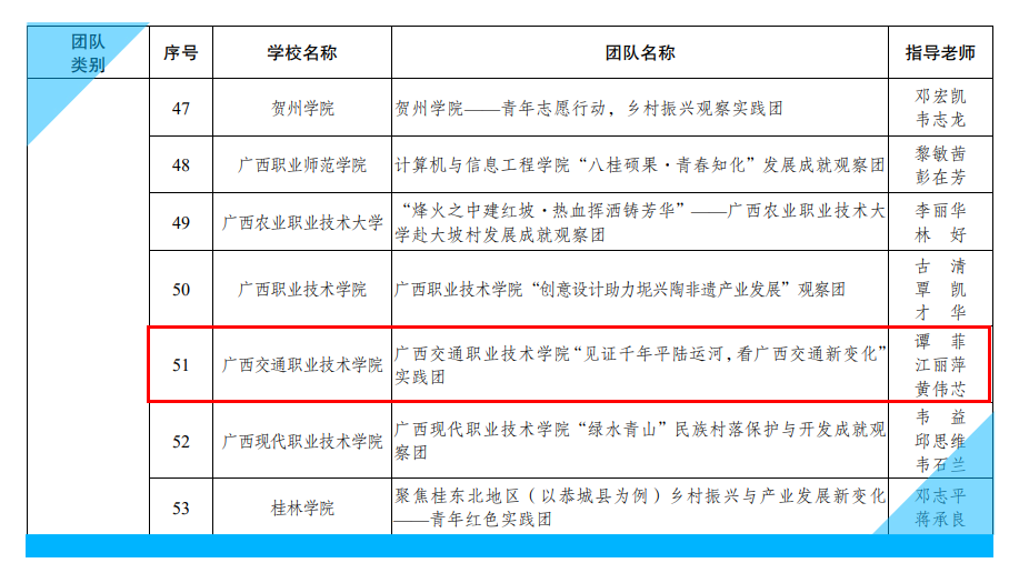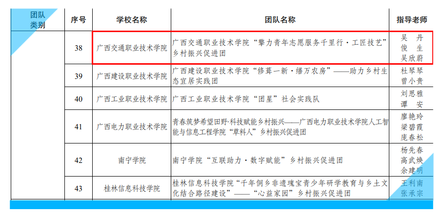 据悉,共青团广西区委等主办单位从预期社会效益、可实施性、服务形式、预期成果、学生收获等五大方面对申报材料进行综合评估,最终评定全国重点团队68支、自治区重点团队200支。在“大学工”队伍的支持帮助、校团委的精心组织、各学院团委的积极配合下,汽车工程学院“擎力青年志愿服务千里行·工匠技艺”乡村振兴促进团和航海工程学院“见证千年平陆运河,看广西交通新变化”实践团获评全国重点团队,校团委“志智双育·拔群故里·红色研学”乡村振兴促进团、“社校联动三基色”红石榴服务团获评自治区重点团队。