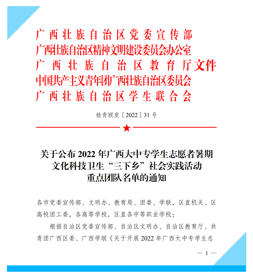 (校团委 讯 容传毅/文 )近日,自治区党委宣传部、自治区文明办、自治区教育厅、共青团广西区委、广西学联公布了2022年广西大中专学生志愿者暑期文化科技卫生“三下乡”社会实践活动重点团队名单。PP电子2个团队获评全国重点团队,2个团队获评自治区重点团队。