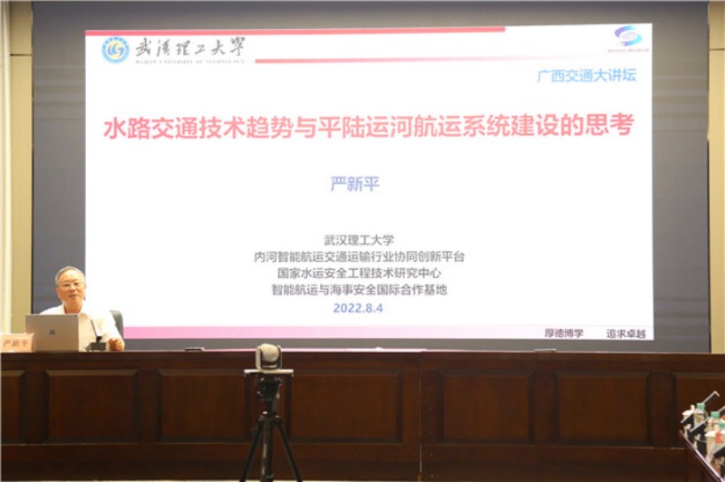 会上,中国工程院院士、武汉理工大学首席教授严新平作“水路交通技术趋势与平陆运河航运系统建设的思考”专题讲座,他从西江航运现状、平陆运河工程特点等方面切入分析,充分梳理未来水路交通发展的技术趋势,提出平陆运河新一代航运系统控制技术、编队航行技术、换班模式创新等建设营运策略以及打造平陆运河“新一代航运系统”建设样板工程等建设性建议。