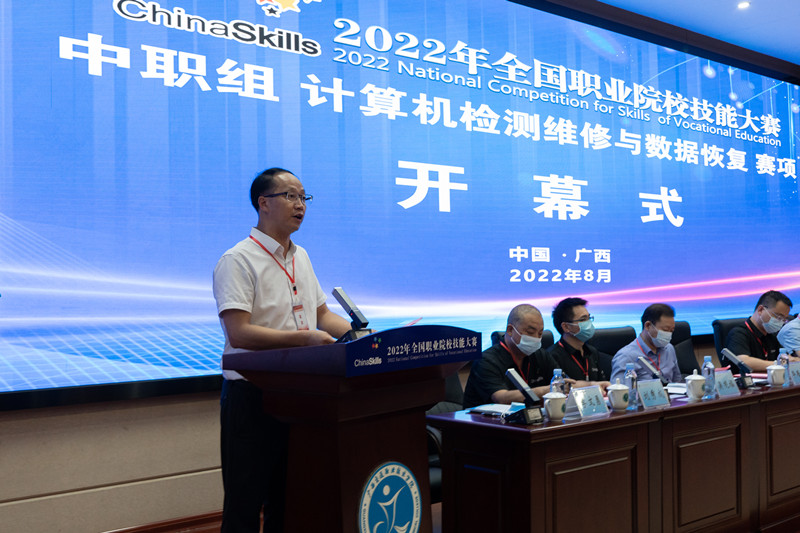 广西壮族自治区教育厅职成处处长覃壮才在致辞中指出,举办全国职业院校技能大赛,被实践证明是推进职业教育高质量发展的有力抓手,希望通过技能大赛,进一步促进职业院校瞄准新时代技术变革和产业优化升级方向,促进应用型专门人才和高素质劳动者培养模式的改革与发展,以赛促学、以赛促教,推进实现校企合作、工学结合,推进实现教育链、人才链与产业链、创新链的有效衔接,为培养建设技能型社会需要的能工巧匠、大国工匠打下坚实基础。