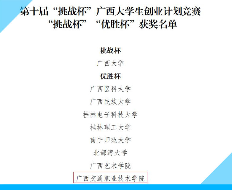7月4日,竞赛组委会发布的推报“挑战杯”中国大学生创业计划竞赛全国决赛项目名单公示结束,全区高职推报全国决赛项目5个,学校路桥学院杜烨宇、莫耀森、何华柳等同学项目《客运行李管家——全新的行李自动存放设备》、汽车学院黄赠元、黄书哲、石忠沂等同学项目《智能交通——智能网联自动驾驶观光车》成功入围各占1席,为历年来最好成绩。
