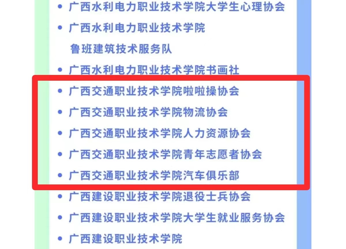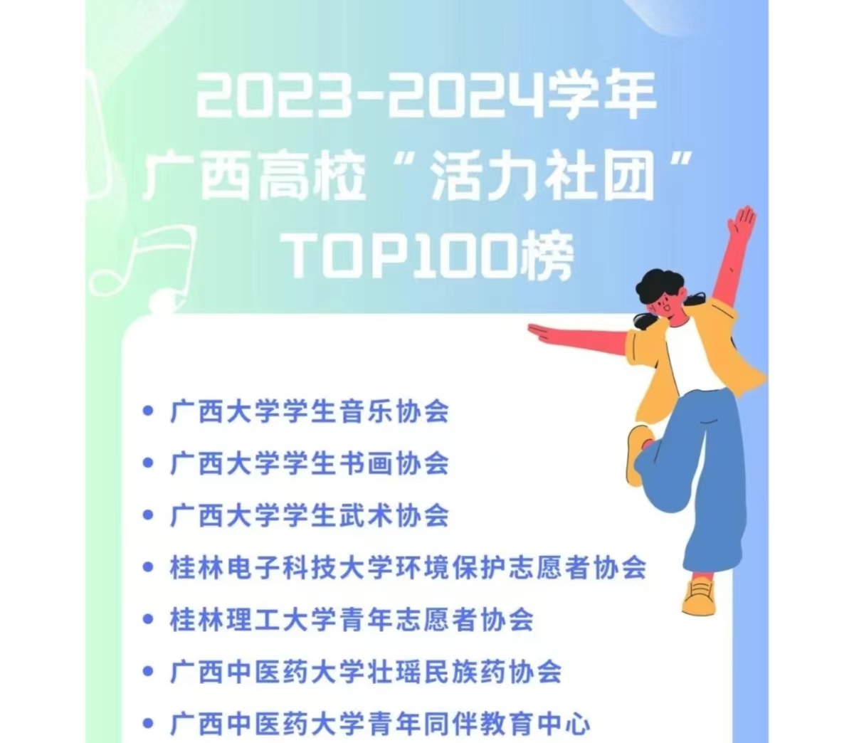 (校团委讯 胡兰蕊、张帅/文)近日,共青团广西区委发布2023年-2024年广西高校“活力社团”TOP100榜,学校5个学生社团啦啦操协会、物流协会、人力资源协会、青年志愿者协会、汽车俱乐部成功入选,获奖数量位居广西高校前列。
