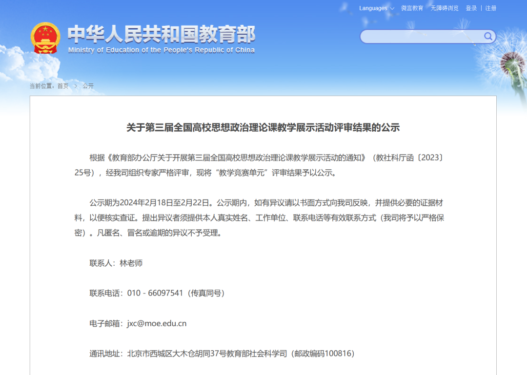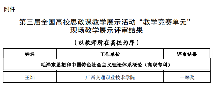 (马克思主义学院 讯)近日,教育部第三届全国高校思想政治理论课教学展示活动评审结果揭晓,学校马克思主义学院王灿老师荣获“毛泽东思想和中国特色社会主义理论体系概论(高职专科)”一等奖,这是PP电子近年来在思政课教学竞赛中取得的新突破。