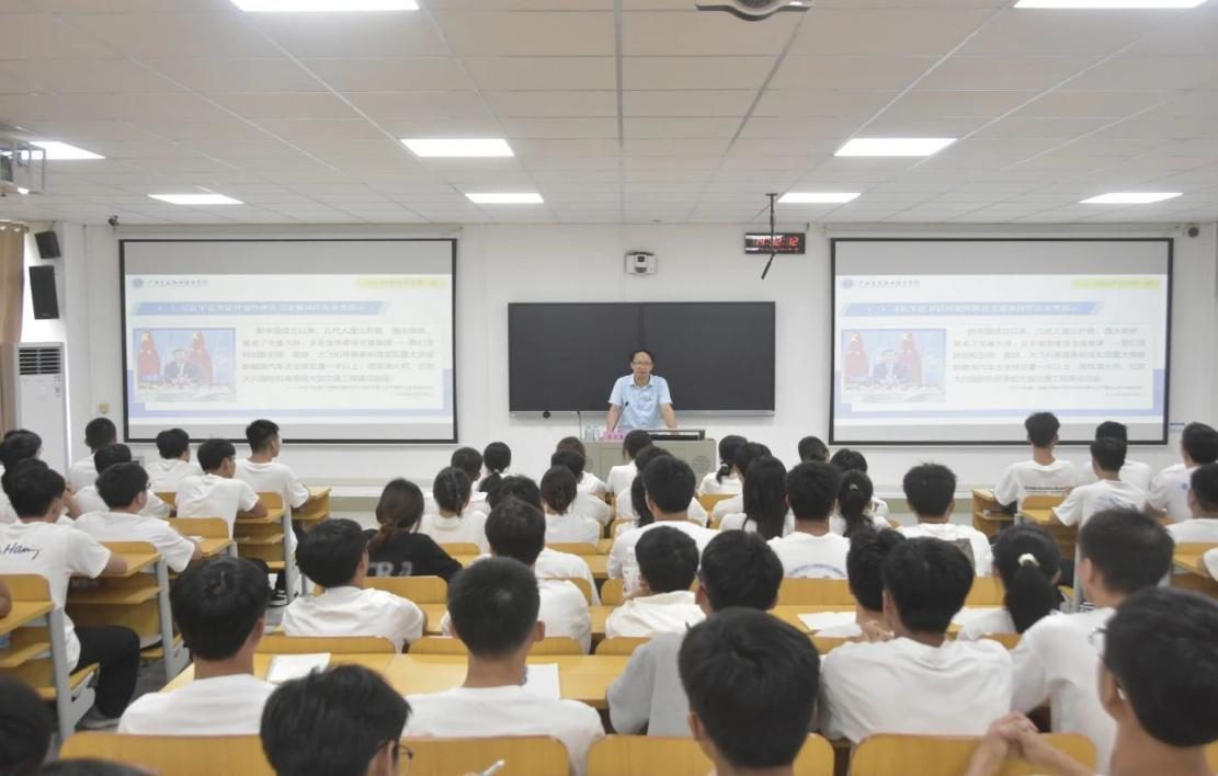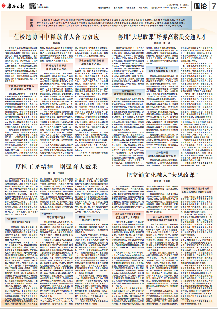 强特色,课程建设显实效。加强以习近平新时代中国特色社会主义思想为核心内容的思政课课程群建设,融合交通特色,挖掘地方红色文化、校史资源,建成15个市厅级示范课堂(其中包括3个“大思政课”示范课堂),24个校级示范课堂,突出示范引领,高质量拓宽“大思政课”大课堂阵地。重知行,实践教学出成绩。统筹协调“思政小课堂”与“社会大课堂”,搭建数字思政资源新平台,创新“互联网+思政课”,建成了1个国家级职业教育示范性虚拟仿真实训基地、1个交通精神虚拟仿真资源库。与广西壮乡英雄文化园、广西展览馆,广西交通投资集团、广西汽车集团等单位和组织建起了10个“大思政课”实践教学基地,高水平搭建“大思政课”大资源平台。巧协同,共育大师资力量。着力打造一支“专职为主、专兼结合、数量充足、素质优良”的队伍。积极聘请党政领导、科学家、老同志、先进模范等担任思政课兼职教师,建设专兼结合的师资队伍。如,特聘广西汽车集团首席技能专家郑志明等大国工匠担任思政课教师进校讲学,形成校内外协同育人合力,高标准构建“大思政课”大师资体系。