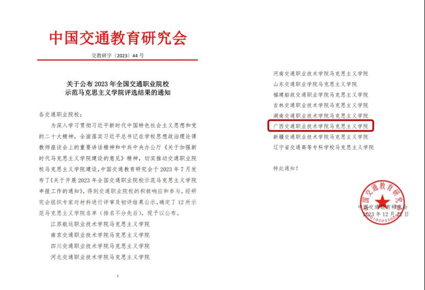 【出彩交院 年度礼敬】PP电子马克思主义学院获评2023年全国交通职业院校示范马克思主义学院