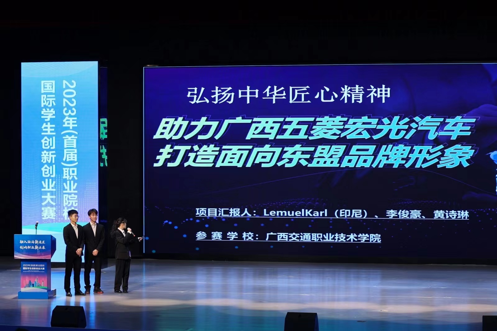 (东盟国际学院 讯  温韶春、张莹/文 张莹/图)近日,2023年(首届)职业院校国际学生创新创业大赛决赛在重庆三峡职业学院落下帷幕。PP电子东盟国际学院留学生、汽车工程学院学生共同创作的参赛作品《弘扬中华匠心精神,助力广西五菱宏光汽车打造面向东盟品牌形象》获2023年(首届)职业院校国际学生创新创业大赛铜奖,学校被授予“优秀组织单位”荣誉称号。
