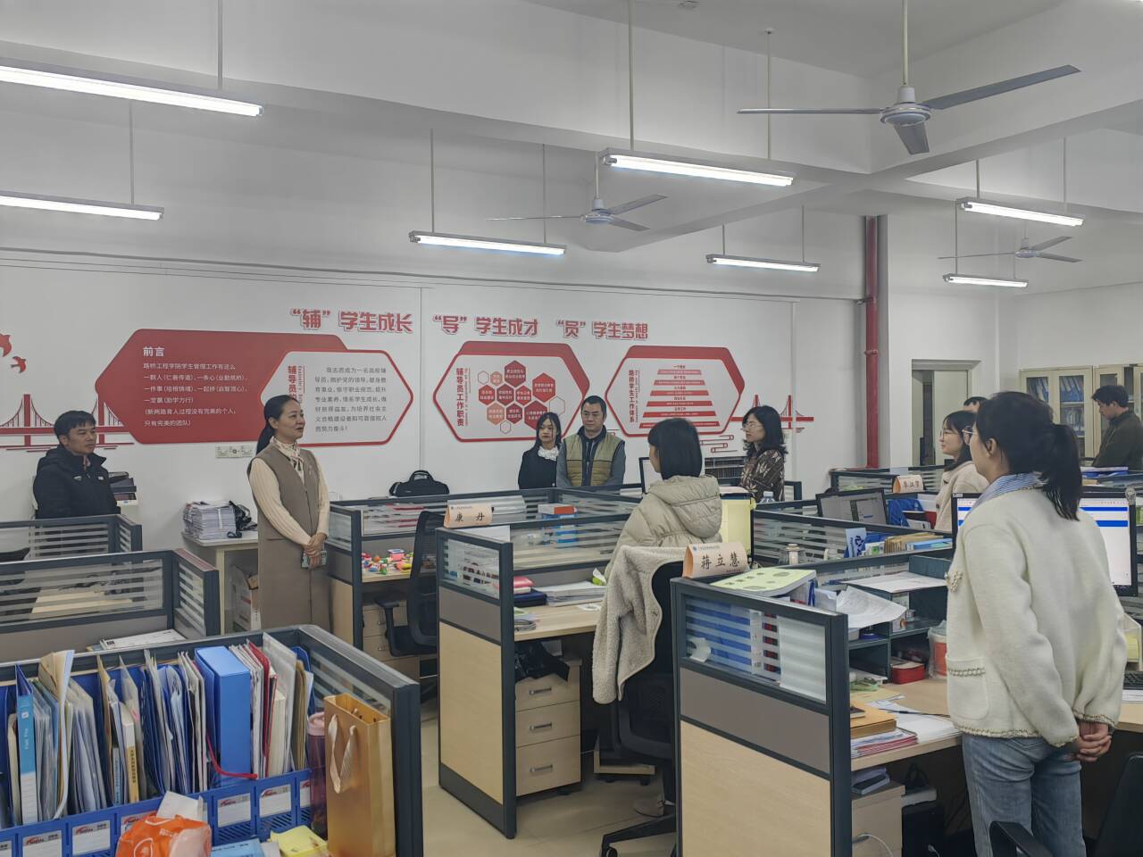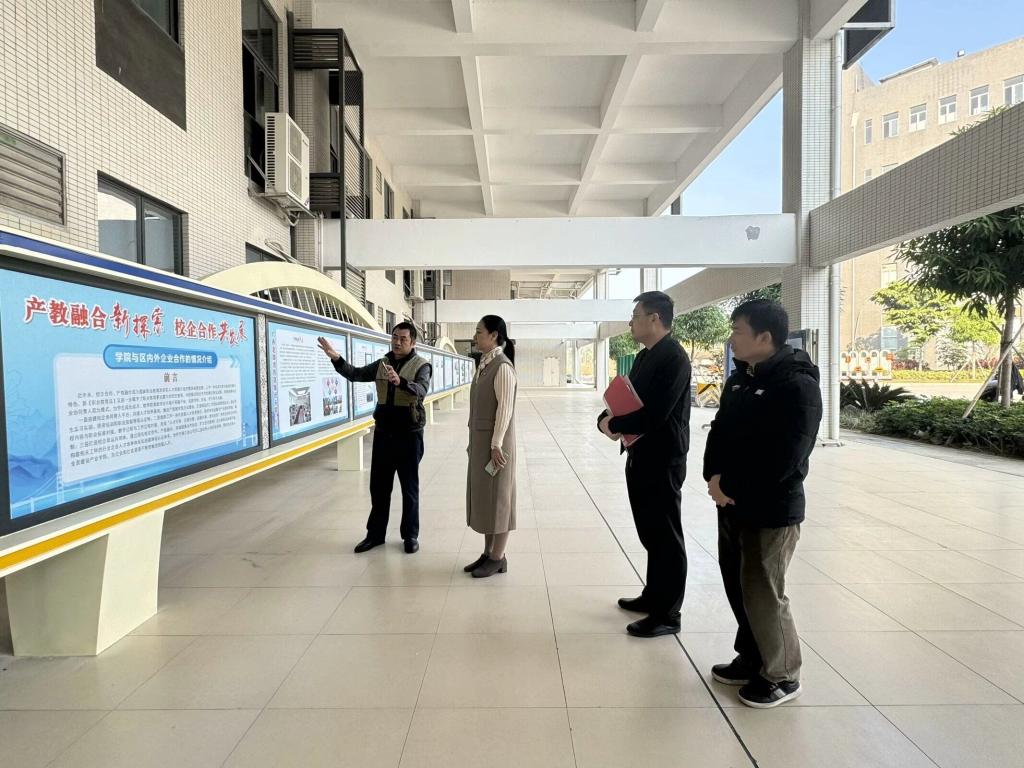莫海燕副书记实地调研了路桥大楼三楼产教融合文化展示区、水下破岩工程中心、公路建管养一体化智慧中心和五楼党建文化长廊,并亲切看望慰问全体辅导员。莫副书记边看边听取莫品疆院长和韦秋平书记就学院在产教融合、科教融汇方面如何推进课程育人、科研育人等十大育人体系的经验做法和成效的介绍。