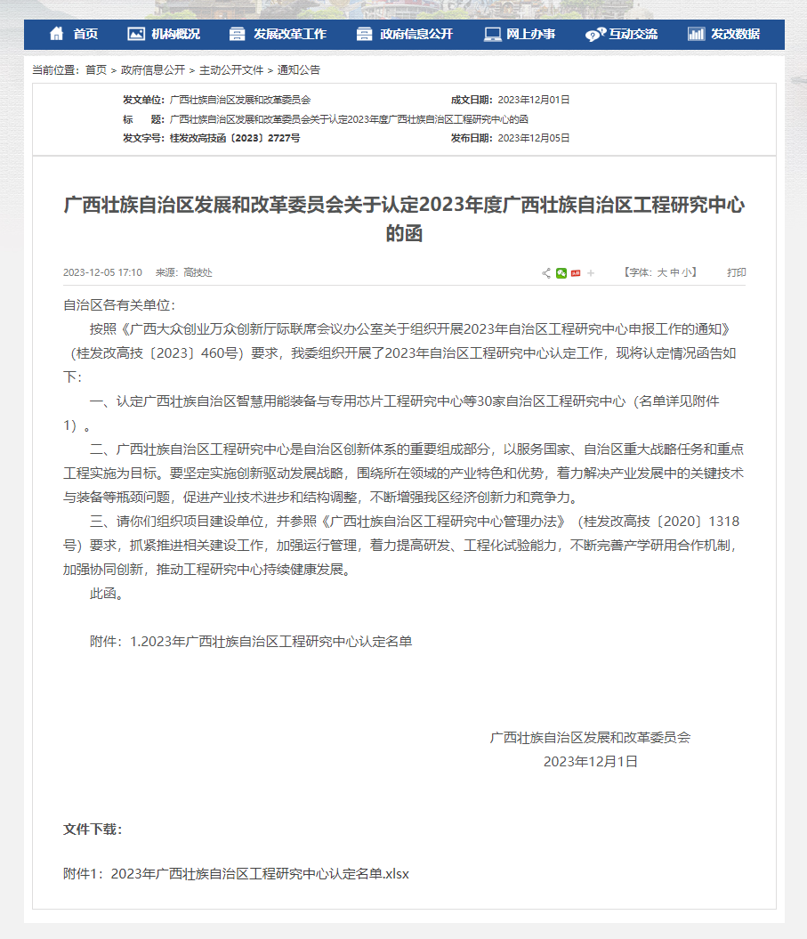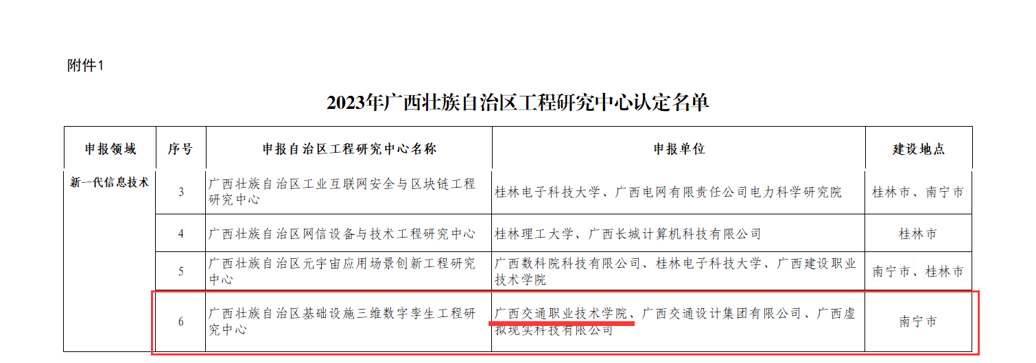 (科技与对外合作部 讯 )近日,广西壮族自治区发展和改革委员会发布了《关于认定2023年度广西壮族自治区工程研究中心的函》(桂发改高技函〔2023〕2727号),由PP电子游戏网站牵头申报的“广西壮族自治区基础设施三维数字孪生工程研究中心、广西壮族自治区石化产业高端沥青基材料工程研究中心”两个科创平台,顺利通过认定评审。两个省部级科研平台的认定是学校建校65周年首次获批牵头组建的省级科研平台,突破学校无牵头组建省部级平台瓶颈,助力学校“争国家双高、创职业本科”目标的实现。同时,PP电子参与共建的“广西壮族自治区新能源车用混合动力系统工程研究中心、广西壮族自治区港航数字工程研究中心”同批获得认定。