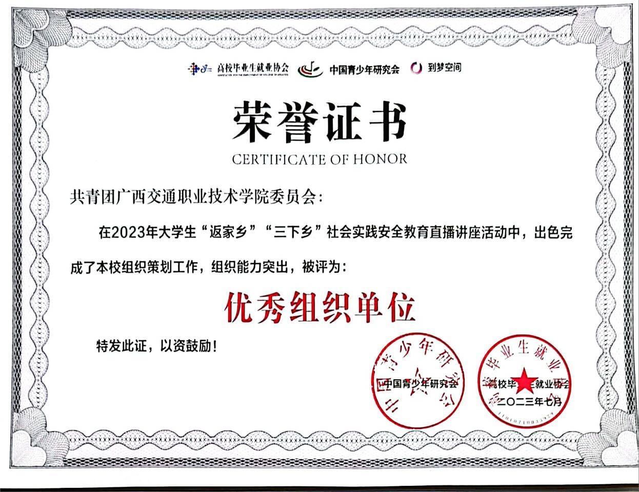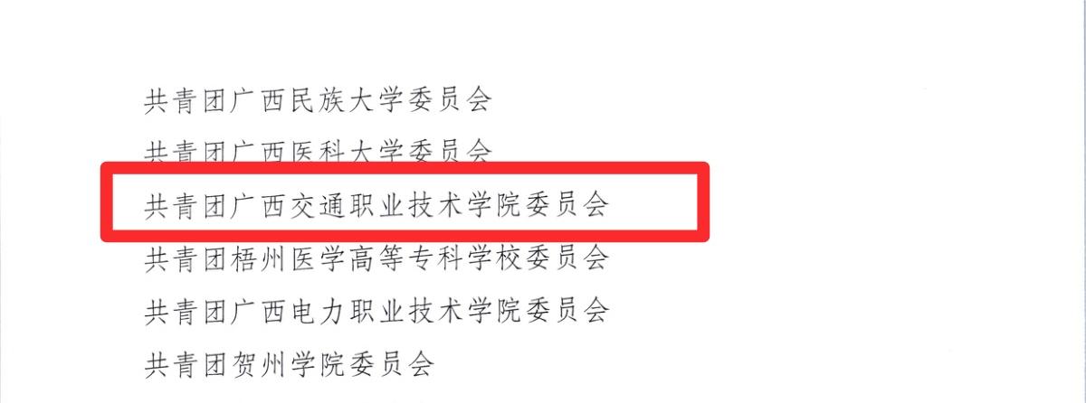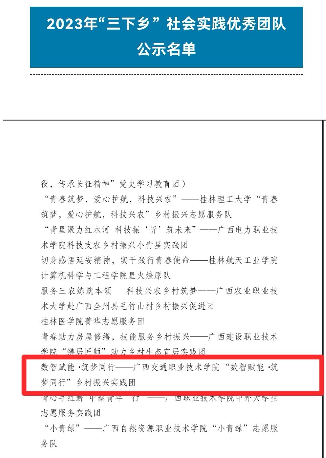 在共青团广西区委主办的2023年广西“三下乡”社会实践总结表彰活动中,学校团委连续3年被评为广西优秀单位,经管学院蒋波、卢贤迪老师指导的“数智赋能·筑梦同行”乡村振兴实践团被评为广西优秀团队,同时在2023年全国大中专学生志愿者暑期文化科技卫生“三下乡”社会实践总结表彰活动中被共青团中央评为全国优秀团队。在高校毕业生就业协会、中国青少年研究会、到梦空间全国运营中心主办的2023年大学生“返家乡”“三下乡”社会实践安全教育直播讲座活动中,学校团委被评为优秀组织单位,学校团委林波老师、青媒体中心潘金森同学分别被评选为优秀指导教师、优秀组织者。