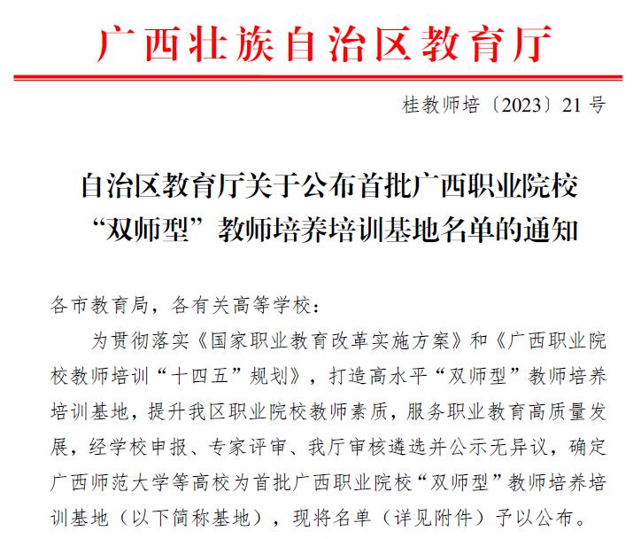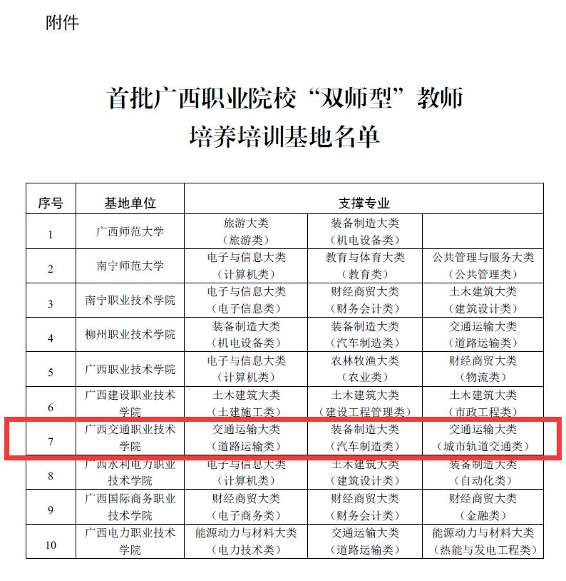 (人事处、教师工作部(教师发展中心) 刘佳嘉/讯)近日,自治区教育厅印发《自治区教育厅关于公布首批广西职业院校“双师型”教师培养培训基地名单的通知》,PP电子申报的自治区级职业院校“双师型”教师培养培训基地(道路运输类、汽车制造类、城市轨道交通类)成功入选,PP电子也成为了广西拥有该基地的10家单位之一。