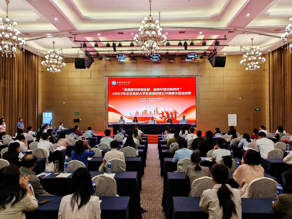 (马克思主义学院 讯 农涛 朱青穗/文、图)10月21日,由自治区教育厅主办、广西民族大学承办的“新思想引领新征程·新青年建功新时代”——2023年全区高校大学生讲思政课公开课展示活动现场决赛中,由学校马克思主义学院王晓艳老师、陆艳花老师、农涛老师指导,温普淳、李美枝、彭欣怡、韦静霞、朱诗桦等学生创作的作品《做改革生力军,为交通强国添动力》荣获高职高专组一等奖,由梁丽圆老师、朱青穗老师、张立炜老师指导,龙婷婷、吴明泽、杨耀铭、刘建、吴连照、熊德等学生创作的作品《生态“颜值”变绿色“产值” 绘就美丽画卷》荣获高职高专组二等奖。