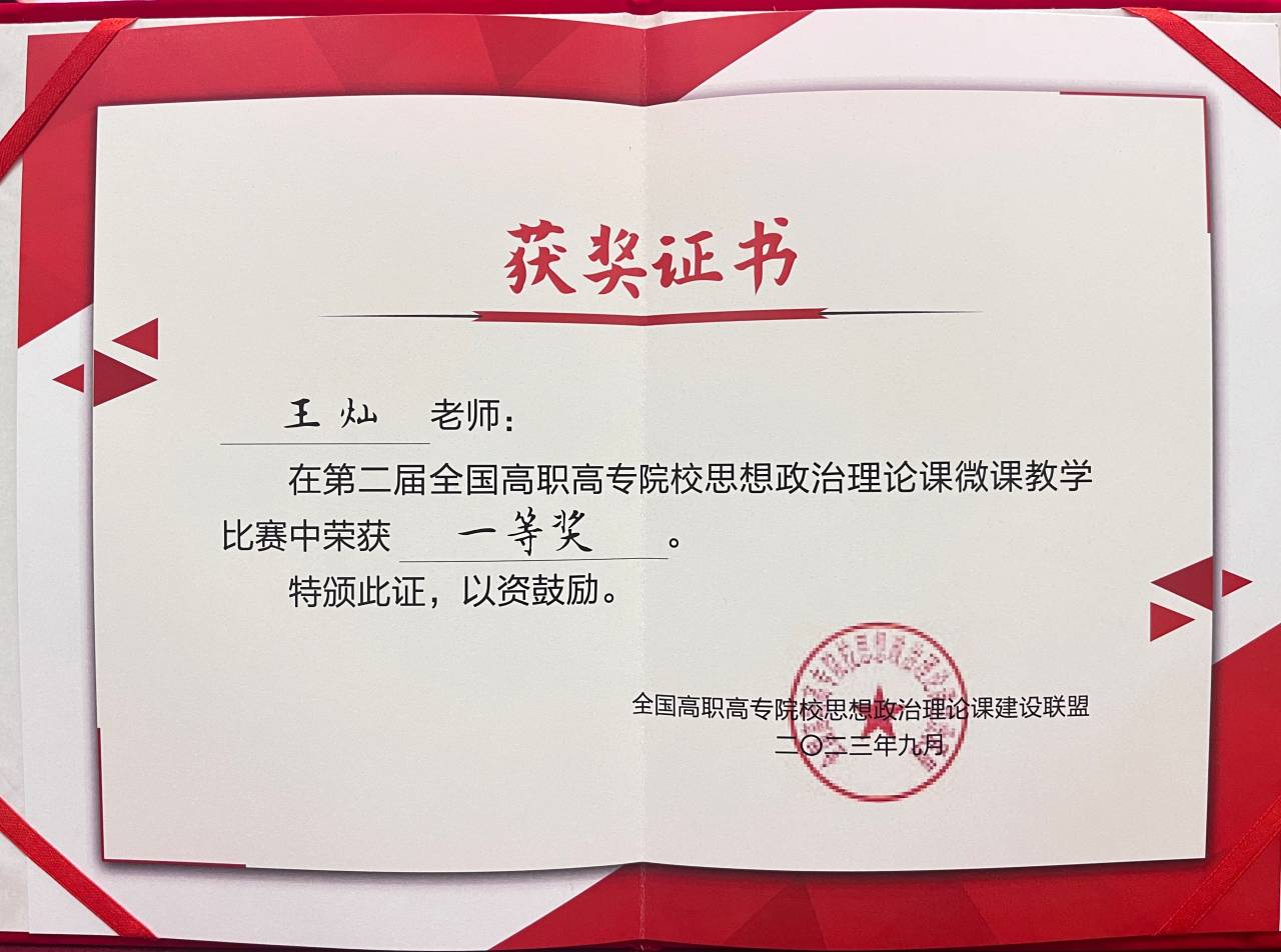 大赛由全国高职高专院校思想政治理论课建设联盟主办、云南交通职业技术学院承办。比赛分为校级初赛、省级复赛和全国总决赛三个阶段。经全国高职高专思政课教学领域的名师、专家匿名评审,共评出特等奖6名、一等奖15名、二等奖25名、三等奖36名。王灿老师在比赛中凭借充分的赛前准备、扎实的基本功底、出色的现场表现,最终取得优异成绩,充分展示了学院思政课教师过硬的教学能力和良好的教学风采。