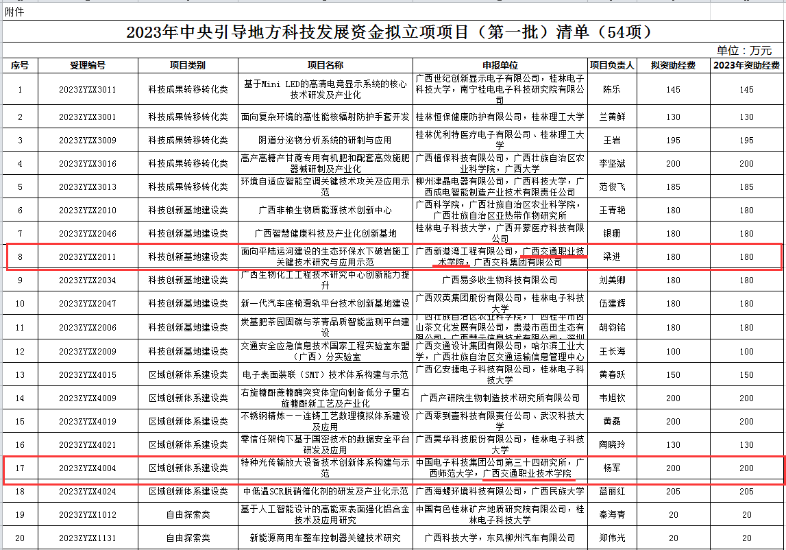 近日,自治区科技厅公示2023年中央引导地方科技发展资金拟立项项目(第一批)(公示已结束),PP电子参与申报的《面向平陆运河建设的生态环保水下破岩施工关键技术研究与应用示范》和《特种光传输放大设备技术创新体系构建与示范》2个项目喜获立项,立项金额分别为180万、200万。