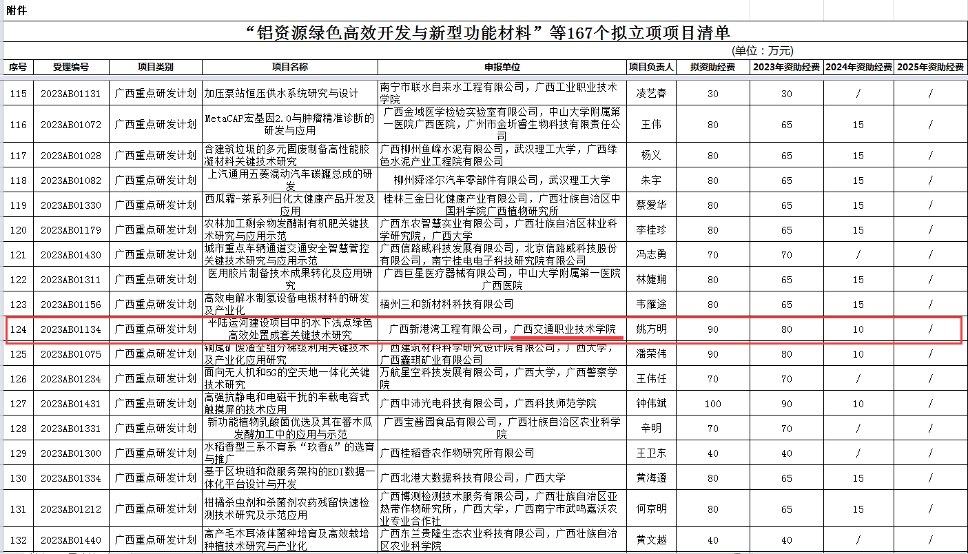 近日,自治区科技厅公示2023年广西重点研发计划项目等167个立项项目(公示已结束),PP电子参与申报的《平陆运河建设项目中的水下浅点绿色高效处置成套关键技术研究》项目喜获立项,立项金额为90万。这是PP电子继2022年获得广西重点研发计划项目后,再接再厉,再次获得立项。