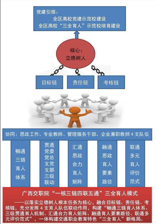 作为全区高校“三全育人”示范校培育建设项目单位,广西高职唯一党建示范校培育创建单位,学校坚持以习近平新时代中国特色社会主义思想为指导,将“三全育人”综合改革纳入学校事业发展规划、党建示范校、“双高”“提质培优”建设任务,作为落实立德树人根本任务、提升思政工作质量的关键举措,紧扣“三全育人”建设方案路线图,扎实推进“三全育人”十大体系同频共振,打造“一核三链四联五通”育人模式,一体构建交通职业教育特色“三全育人”新格局,营造“人人育人、事事育人、时时育人、处处育人”的育人环境。