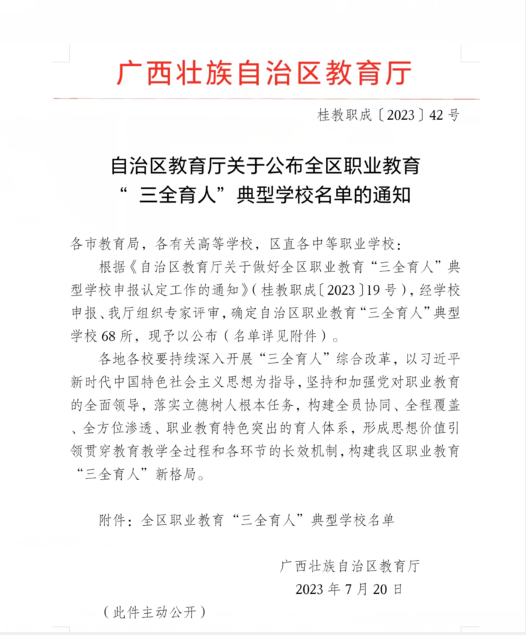 近日,自治区教育厅公布全区职业教育“三全育人”典型学校名单,PP电子成功入选该项目。这是PP电子贯彻落实立德树人根本任务,强化三全育人体系建设取得的又一项标志性成果。