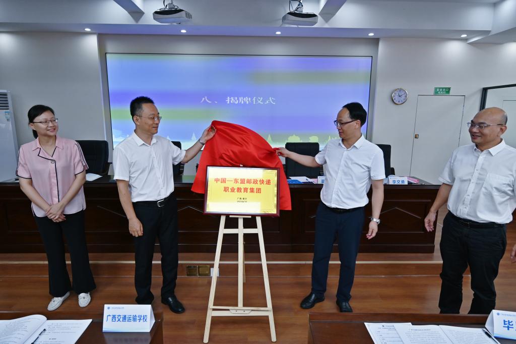 会上,陈津维总工程师、王卓副处长,与会成员单位代表们共同见证莫祖俊副局长、李文勇校长为中国—东盟邮政快递职业教育集团揭牌。