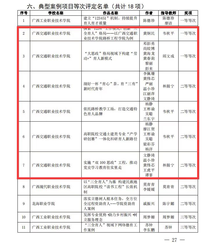 此次高职院校“典型案例”获奖名额共有18项,仅PP电子就占据了11项。其中,路桥工程学院报送的《探索“1234”工作模式,创新“三全育人”格局——以PP电子游戏网站路桥工程学院为例典型案例》、学生工作部和土建学院报送的《“大思政”格局视域下构建“劳动+”育人新模式》获得“典型案例”一等奖,路桥工程学院案例入选“优秀典型案例”,选送的其他案例获得二等奖4项,三等奖5项。