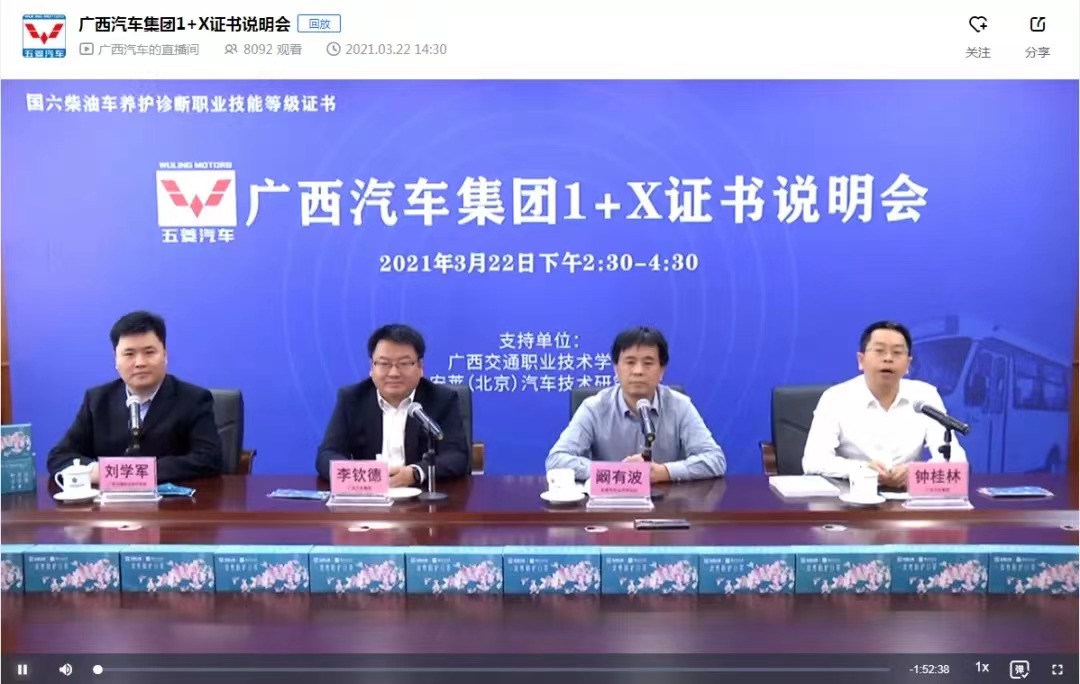 由广西汽车集团有限公司主办,PP电子游戏网站,安莱(北京)汽车技术研究院召开“1+X”国六柴油车养护诊断证书线上发布会