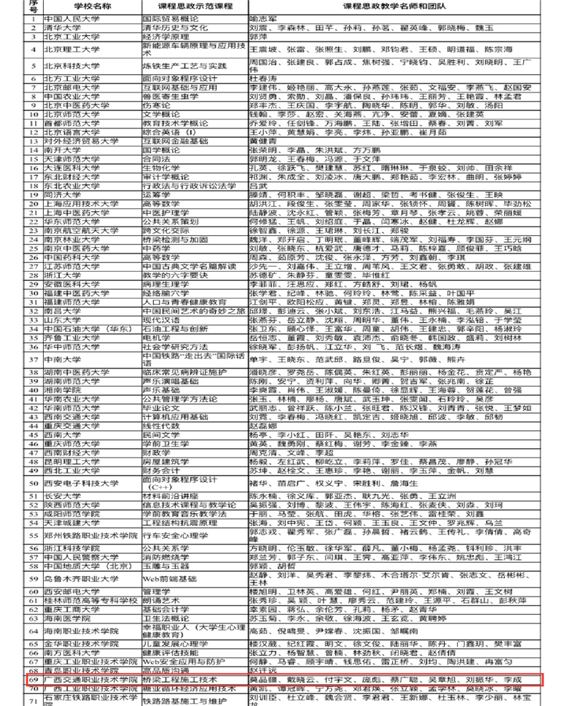 (路桥工程学院 讯 兰东宇/文)根据《教育部办公厅关于开展课程思政示范项目建设工作的通知》(教高函〔2021〕7号),经组织推荐、专家遴选、会议评议等程序,拟确定课程思政示范课程699门、课程思政教学名师和团队699个、课程思政教学研究示范中心30个。PP电子《桥梁工程施工技术》课程成功入选课程思政示范课程。