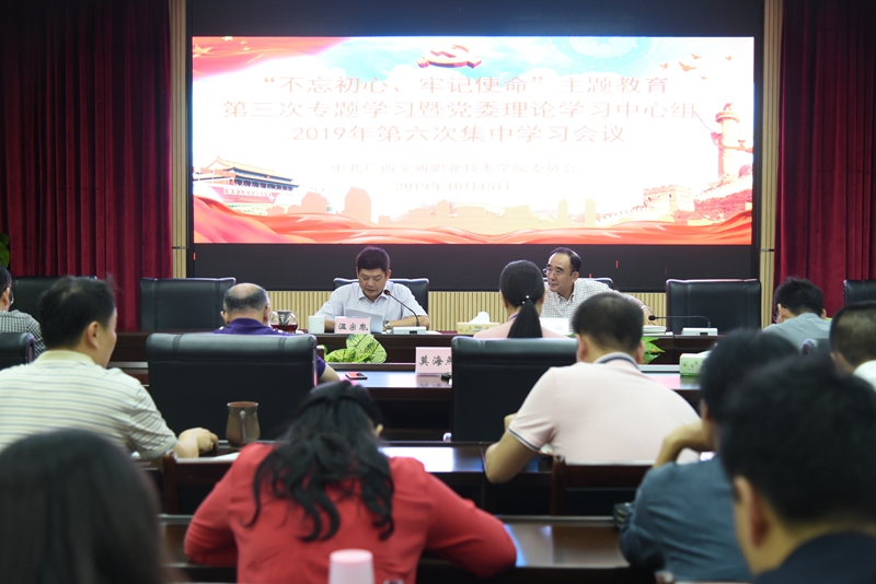 (党工部 讯 陆丽程)10月15日,根据上级部署和要求,结合我院“不忘初心、牢记使命”主题教育安排,学院召开“不忘初心、牢记使命”主题教育第三次专题学习暨党委理论学习中心组2019年第六次集中学习会议,围绕“学...