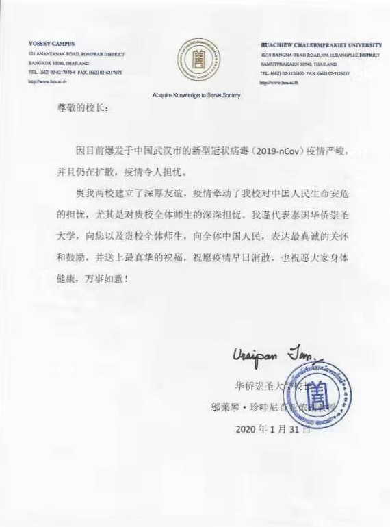 泰国华侨崇圣大学致信祝福PP电子全体师生身体健康