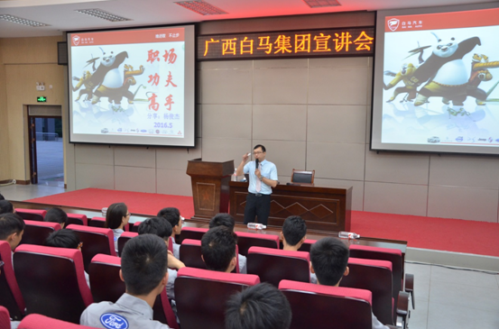 (汽车工程系 讯 吴丹/文 廖俊生/图)5月23日,广西白马集团宣讲会在我院四塘校区综合楼C2多功能厅举行,共200多名学生参加宣讲会。 本次招聘宣讲会由白马集团人事经理杨俊杰主讲,杨经理给同学们上了一堂...