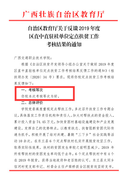 近日,自治区教育厅根据《自治区扶贫开发领导小组办公室关于做好 2019 年度区直中直驻桂单位定点扶贫工作考核结果反馈工作的通知》(桂扶领办发〔2020〕34 号)要求,反馈了2019年度区直中直驻桂单位定点扶贫工作考核...