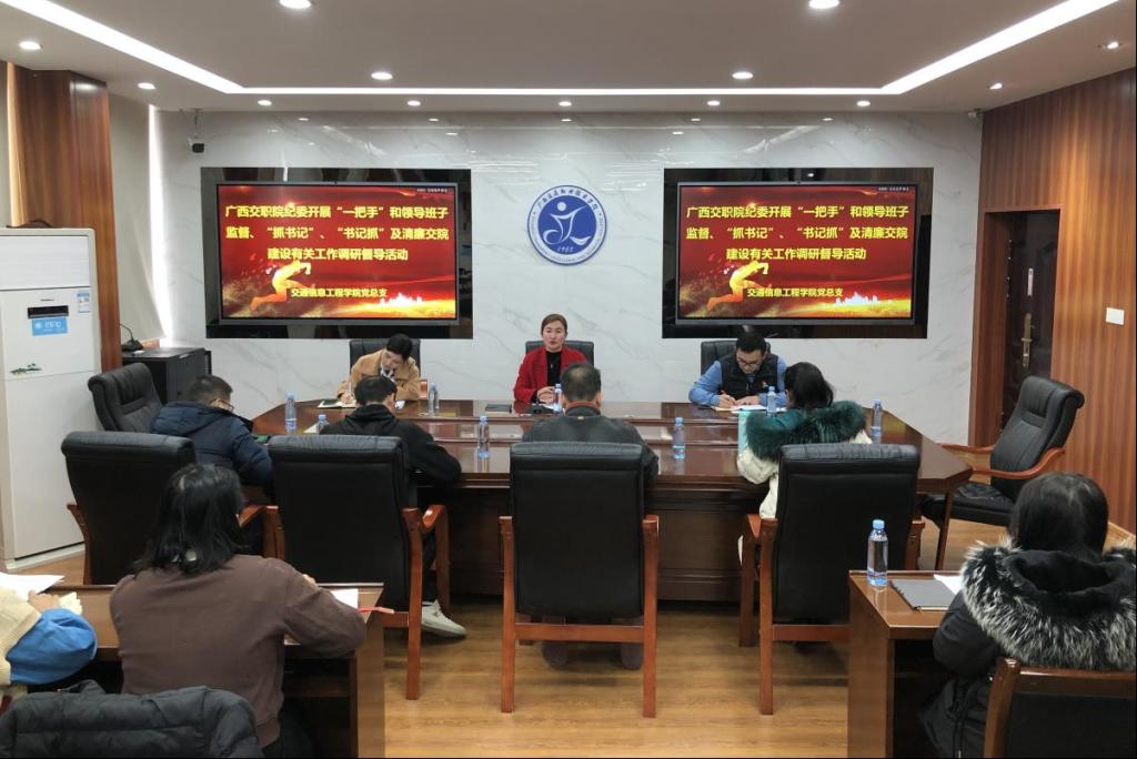 近日,学校纪委麻新桃书记一行到交通信息工程学院开展“一把手”和领导班子监督、“抓书记”、“书记抓”及清廉交院建设有关工作调研督导活动。学院党总支杨顺韬书记、阮兰娟副书记、洪东副院长及党总支委员、各支部书记、2名学生党员代表参加会议。会议现场 首先,交通信息工程学院党总支杨顺韬书记从学习党的二十大报告和习近平总书记重要讲话精神的情况、落实“一把手”和领导班子监督情况、落实“抓书记、书记抓”工作情...