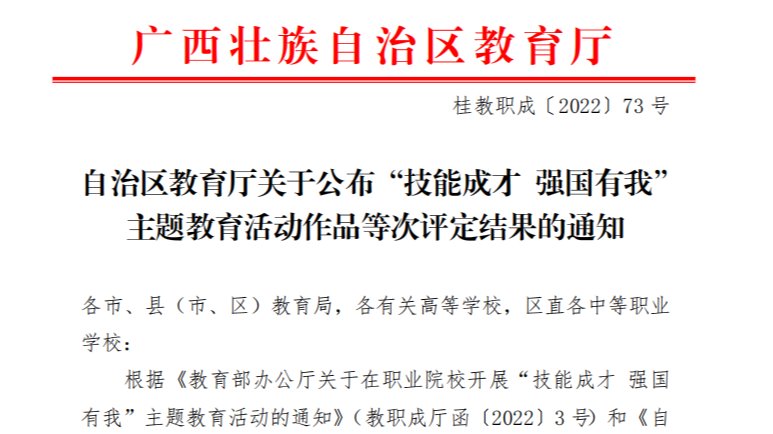 近日,自治区教育厅发布《自治区教育厅关于公布“技能成才 强国有我”主题教育活动作品等次评定结果的通知》,PP电子获得一等奖3项、二等奖18项,三等奖24项的好成绩,其中获得优秀案例1项,典型案例获奖11项,典型案例奖项的获奖率占高职院校的61%。职业院校“文明风采”主题德育活动贯穿全年,其中“技能成才 强国有我”主题教育活动是“文明风采”的重要载体,也是一项针对性和实践性很强的特色德育实践活动,今年首次面向高职...